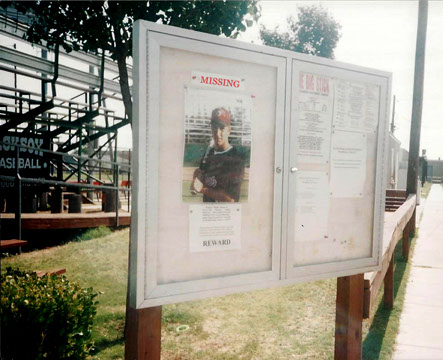 Keith's missing poster displayed at Burkburnett's baseball field (1997).