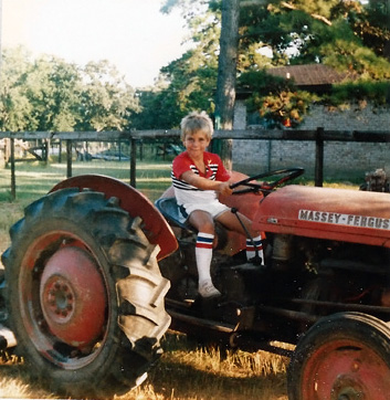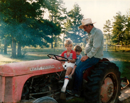 Keith driving a tractor on his Grandparent's ranch in Lufkin, Texas.