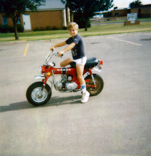 Keith showing off his first motorcycle, a Honda Trail 70, in front of Saint Mark's Church.